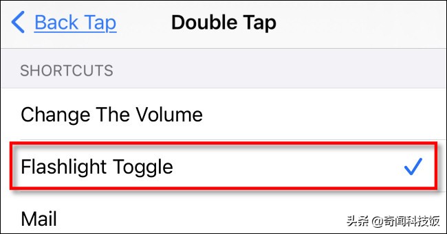 在“后退”设置中,选择要使用手机背面的两下(“双击”)还是三下(“三次”)来激活手电筒,然后选择匹配的选项。