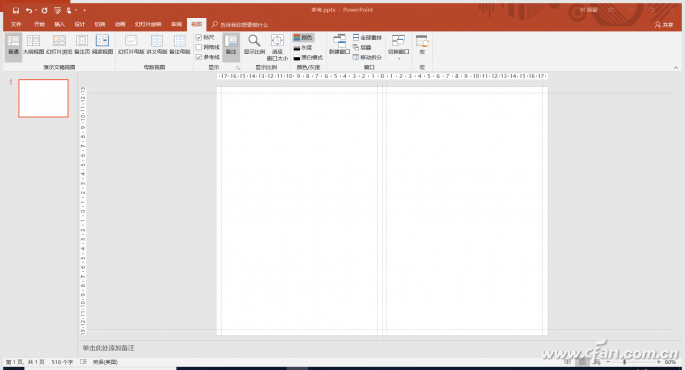 完成页面大小的设置以后,我们还需要对宣传册的页边距进行设置,俗话说:“没有规矩,不成方圆。”在正式排版之前,设置好页边距是很有必要的。PowerPoint中的“页边距”可用“参考线”的方式建立。在“视图”菜单中,将“标尺”和“参考线”旁的复选框打上钩,在界面中会出现一些虚线——那就是参考线,参考线不会被打印出来,只起到辅助视觉观察的作用。而幻灯片左方和上方的刻度就是标尺。它们将为我们之后的设计做好参照。参考线默认在正中位置,水平和垂直方向各一条,我们可以通过右键单击参考线的方式对其进行增删,左键拖动的方式来进行移动。由此,我们便能在幻灯片中画出几条参考线来作为“边框”了。(图2)