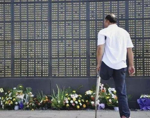 △一位男士在唐山大地震纪念墙前追思亲人
