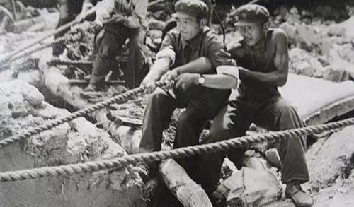 △在没有大型起重工具的情况下,解放军战士用双手拨开重物救人