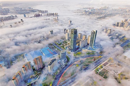 清晨时分,银川市上空弥漫的薄雾,令城市美若仙境。
