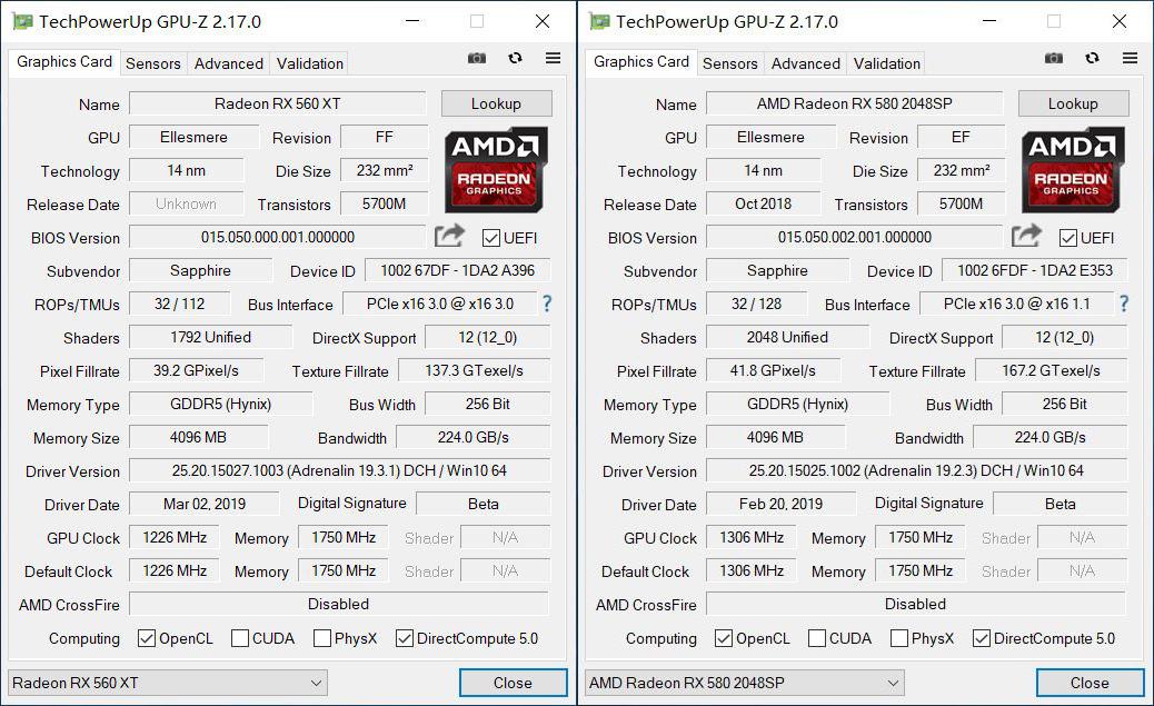 附上RX 560XT 白金版和RX 580 2048SP 白金版OC的GPU-Z图,果然前面没猜测错,核心面积是一致的,只阉割掉了一点纹理单元,光栅化单元也是一致,再看流处理器也就一定差距而且不太大,所以这货必定是RX 470 @570核心下精雕细琢的新产物,所以它就是曾经的RX 470D咯?顺便看看鸡血驱动的表现吧,NVIDIA驱动是最新的419.35 WHQL,AMD则是Adrenalin 2019 Edition 19.3.1。