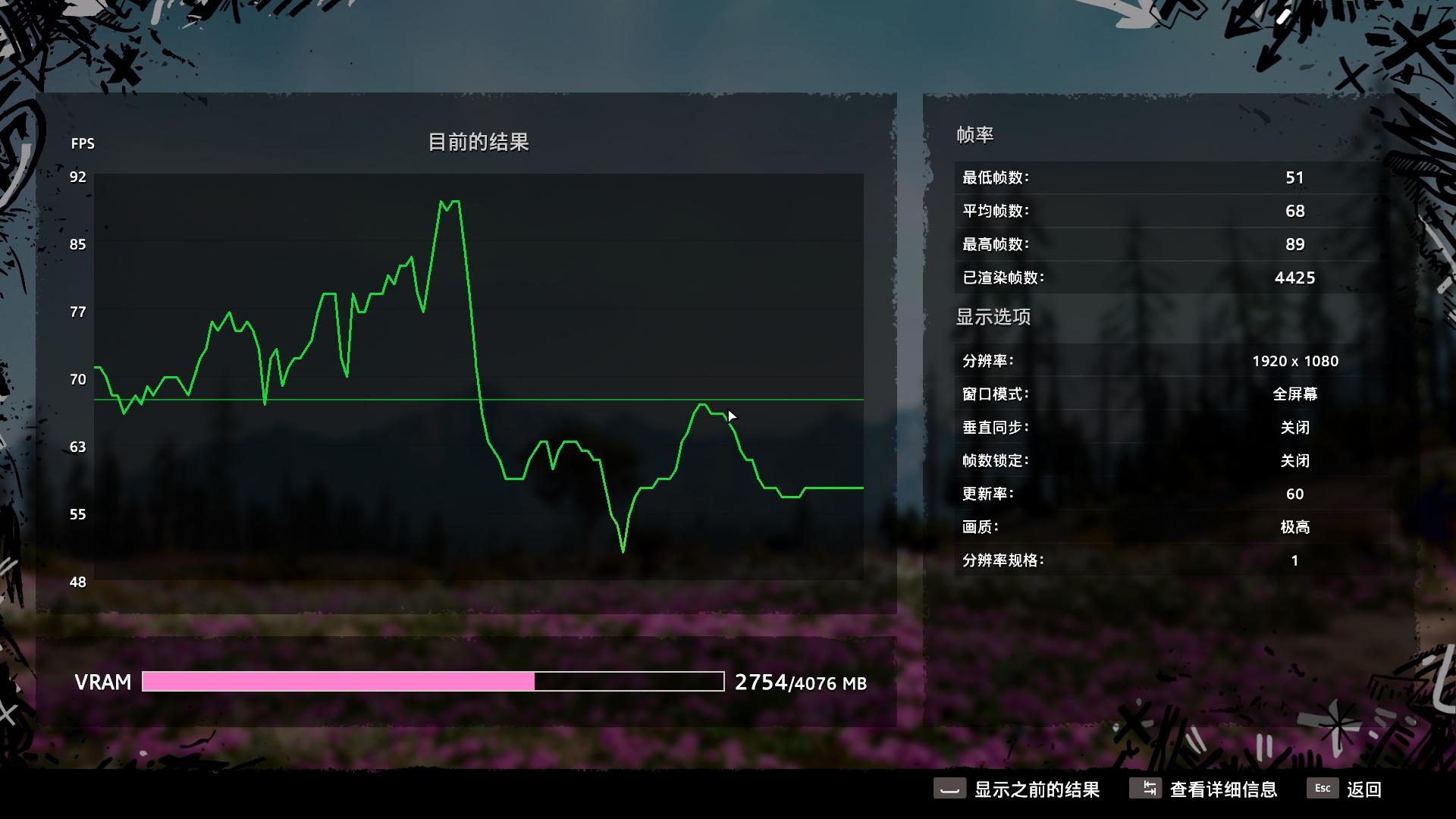蓝宝石RX 560XT 白金版,超频核心1490Mhz@显存2000MHz,平均帧数68fps,最低帧数51fps。