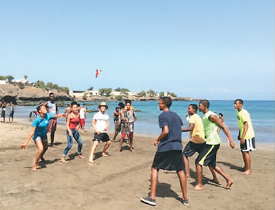 佛得角大学孔子学院学生在海滩上踢毽子。 中国侨网