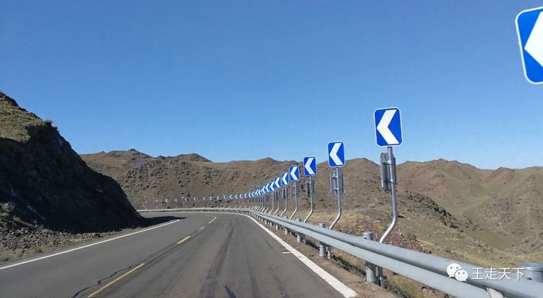 路牌指向一个叫禾角克的地方,姑且认为禾角克山是阿拉山的主峰。这座山很大,从进疆后还是第一次走这么大的山,不仅走得时间长,而且路线险峻,经常有180度的大弯,S形