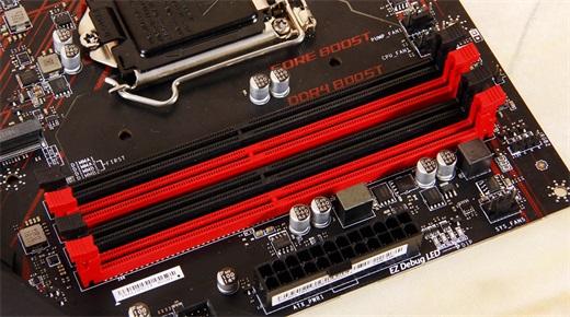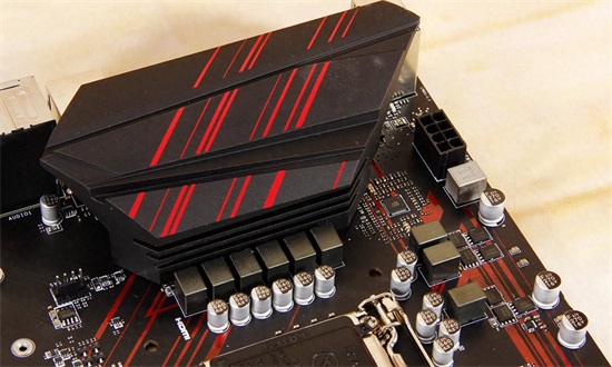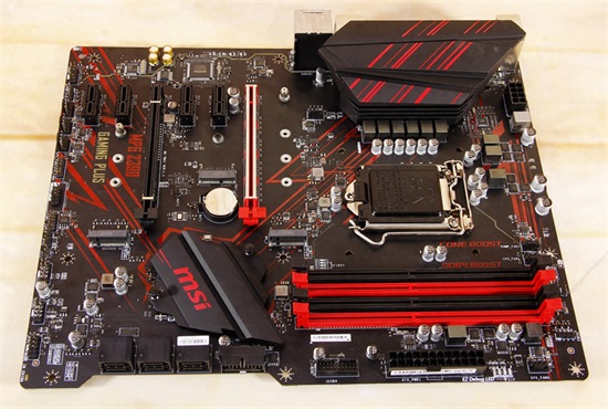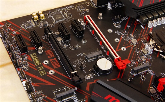 主板整体为红黑配色,4条内存插槽,2条PCI-E 3.0×16,最上面的一条也配有防护装甲,4条PCI-E 3.0×1,两个M.2接口,6个SATA 3.0。优秀的供电和散热设计都不会令人失望。