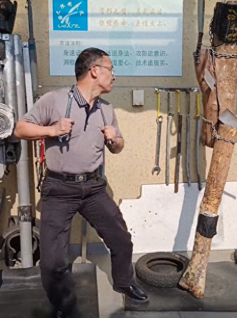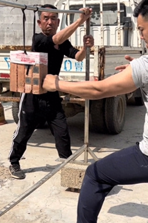 他训练的身影也经常穿梭着田间街头,只见他徒脚站在两根木头桩上,顶着四个大轮胎做着蹲起练习腿部力量。的确,所有中国功夫的背后都是需要付出汗水和努力的,只有吃得苦中苦,才方为人上人。