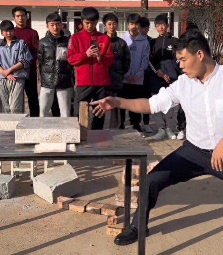 作为武林奇人,这个中国小伙的功夫早已到了炉火纯青的地步。寸拳击断花岩石,手掌拍断耐火砖,寸拳击断大理石,就连“隔山打牛”的功夫也十分精通,即使中间放上两块砖头,他也能利用一个核桃直接击碎砖后的酒瓶。