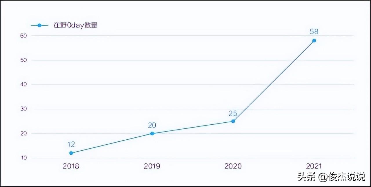 从2018年到2021年披露的在野0-day漏洞数量变化趋势来看,近年来在野0-day漏洞数量逐年增多。2021年的增长趋势最为明显,2021全年披露数量超过2020年全年披露数量的两倍。