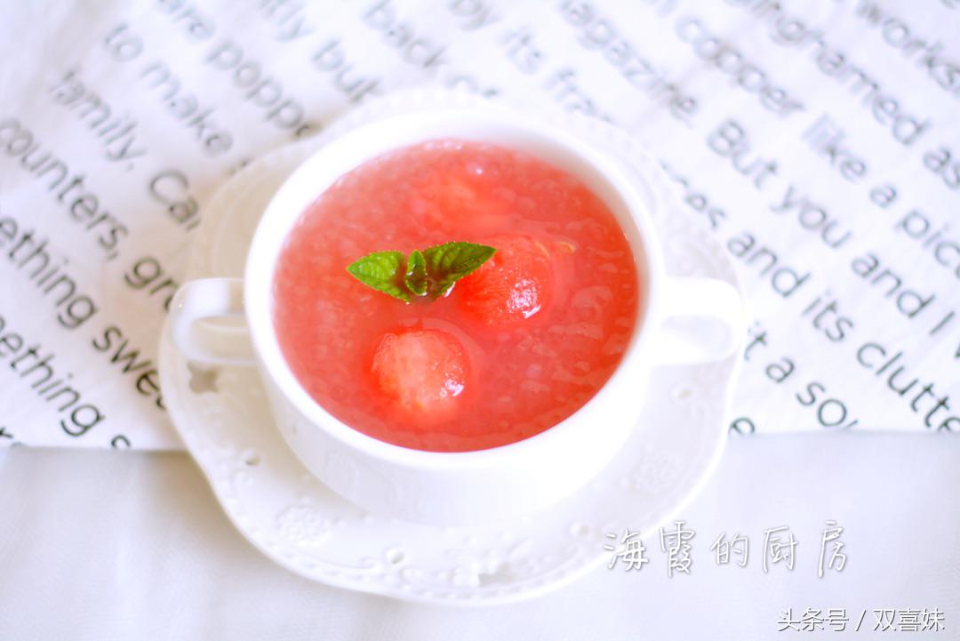 用挖勺器挖两个西瓜球装饰一下,在放个薄荷叶就可以吃了!