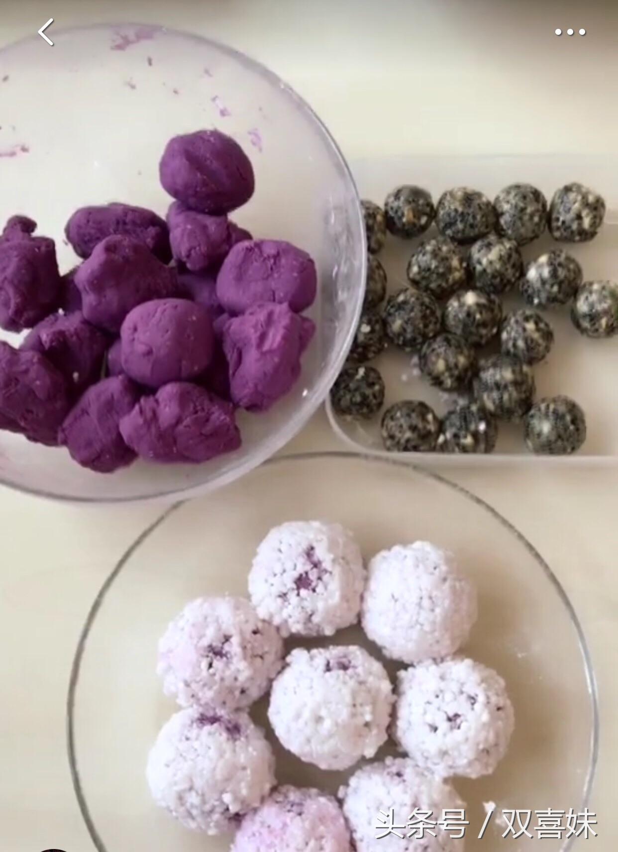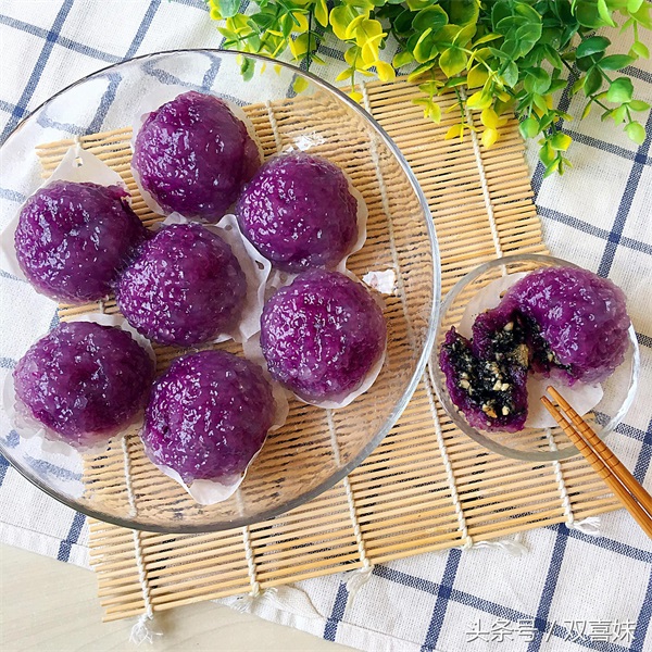 紫薯上锅蒸熟去皮,取500克加糖压成泥。我是把紫薯放米饭锅里一起蒸省事哦!
