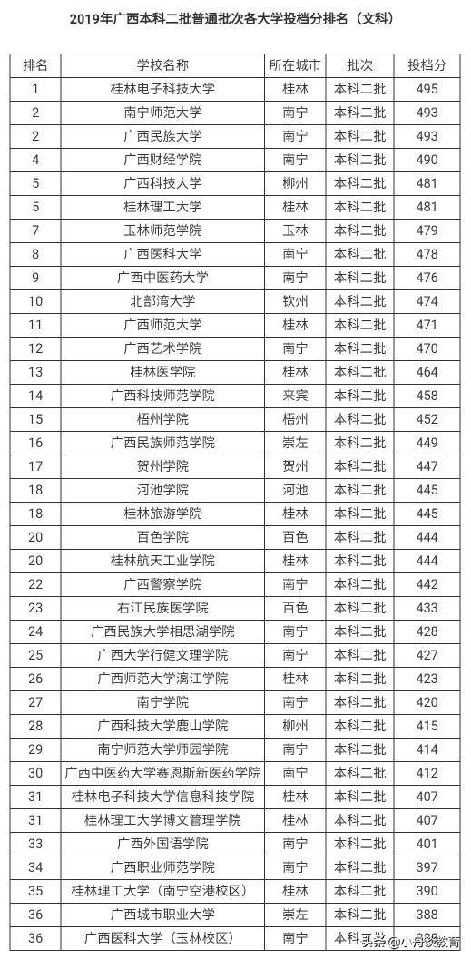 说明:自2015年开始,广西高考本科二批、三批合并为本科二批招生,以下数据包含曾经三批招生的学校,也有些大学的部分专业也在本科二批招生。这里的数据为各高校本科二批招生专业的最低投档分。