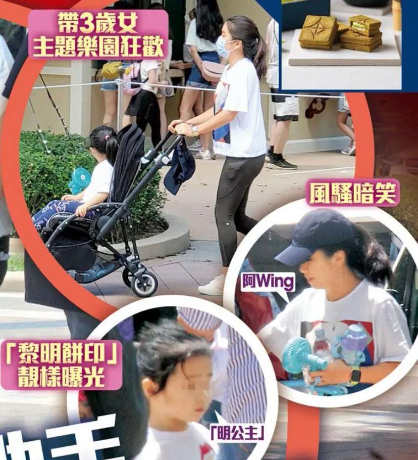 当天阿Wing还带着3岁的女儿旅行,女儿扎着高马尾辫,乖乖地坐在儿童推车上,穿着白色短袖,蓝色裤子,粉色口罩。虽然黎明的女儿没有露脸,但圆圆的眼睛看起来很可爱,一定是个小美人胚。