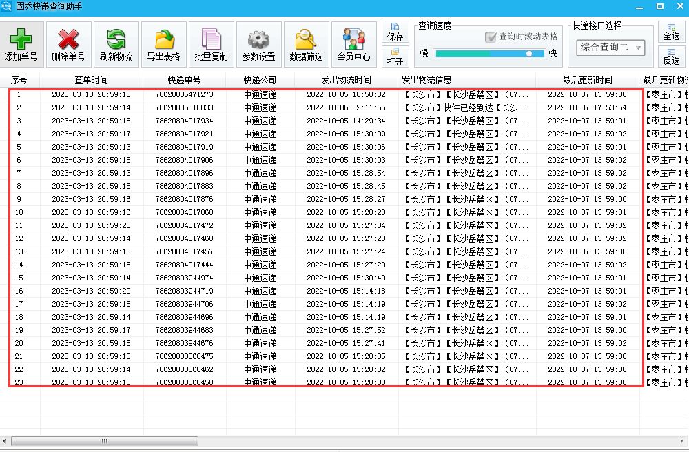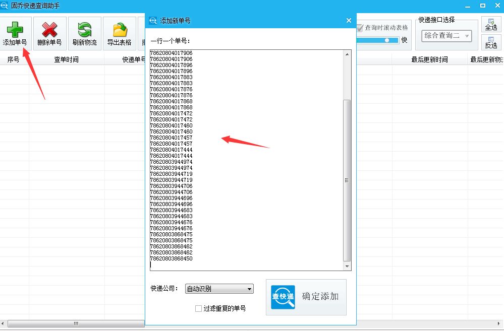 接着勾选“过滤重复的单号”,避免同一单号多次查询,扰乱查询结果,然后点击“确定添加”,软件就开始批量查询快递单号了。