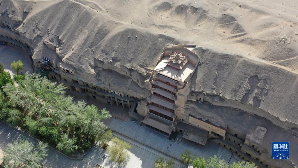 这是世界文化遗产莫高窟的标志性建筑——第96窟窟外木构建筑九层楼(4月18日摄,无人机照片)。