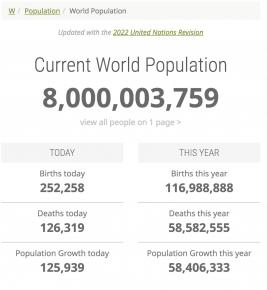 联合国7月份发布的《世界人口展望》报告显示,世界人口预计在本月中旬,达到80亿。就在今天(11月15日),根据统计网站worldometer的实时数据,