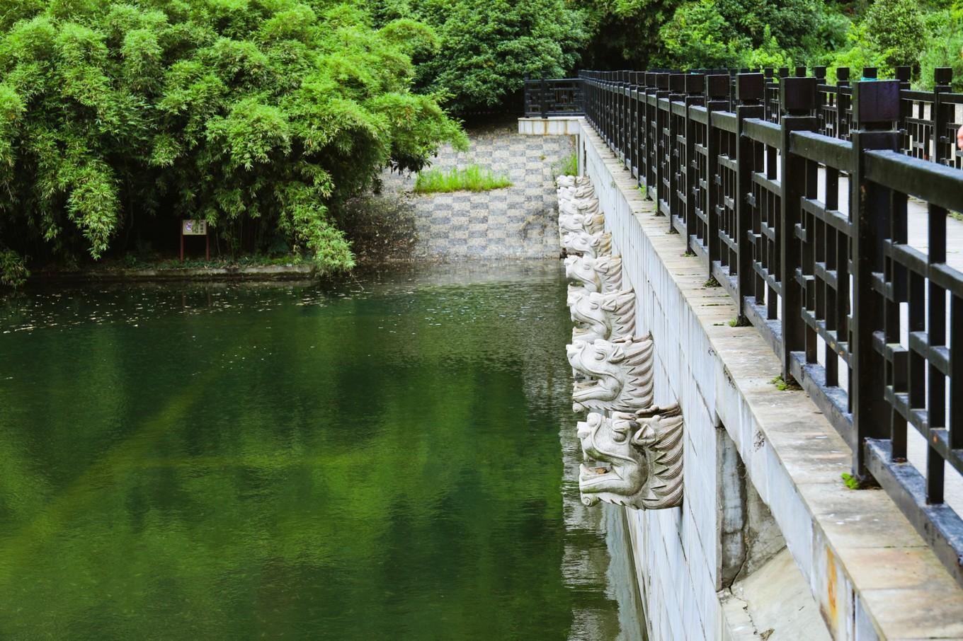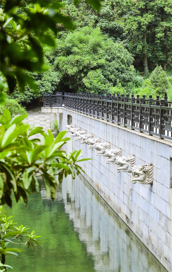 旺山的九龙潭也是一处美丽的打卡点,远望着山脚的亭台,近处是9个石刻龙头的呼应。水面平静中自带怡然,在阳光下像一面绿色的大镜子。同时这里也是旺山科普水利线路中的一个必打卡点,我们去的时候很多小朋友在这里参加夏令营,在欣赏山水的同时,也学到了关于水利以及地理知识,倒是觉得这一点上非常用心,所谓寓教于乐就是如此吧。