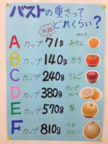 日本网友“@sky_ri9u”在社交网络上分享了一张图,内容是用各种水果,来说明A到F罩杯的胸部(仅一边)有多重,例如A罩杯重71克,约为一颗蜜柑的重量;B罩杯重140克,约为一个柿子的重量;C罩杯重240克,约为一个苹果的重量;D罩杯重380克,约为一个葡萄柚的重量;E罩杯重570克,约为一个丰水梨的重量;F罩杯重810公克,约为一个小哈密瓜的重量。其他网友表示“这可以得诺贝尔奖”、“我只有草莓重啊!救救我”、“那G罩杯咧!怎么少了梦幻的G罩杯”。