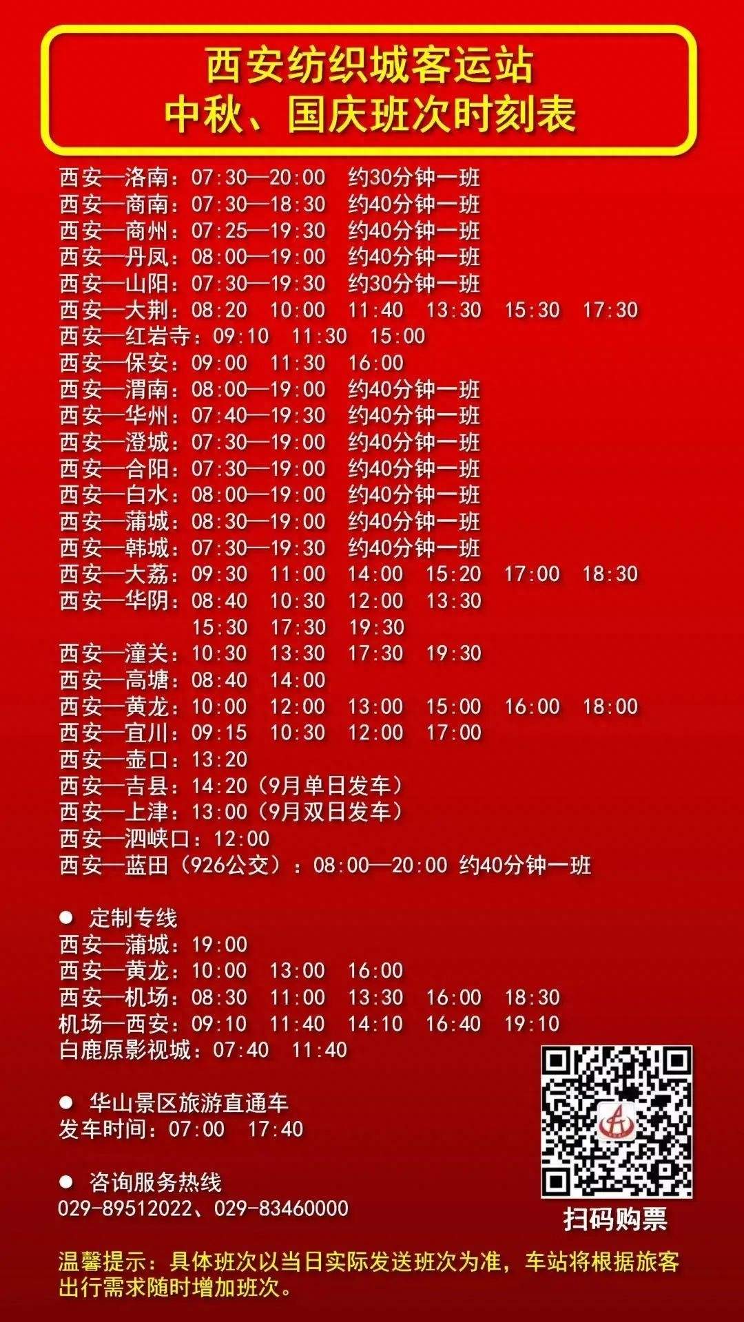 根据往年的客流情况,车站预计出行高峰为9月28日和9月29日,当日的客流量可达平日的2倍。对此,提醒旅客提前购票,以免耽误行程。其中,安康、商洛、渭南、山阳、洛南等方向车票比较紧张,如时间允许可错峰出行。