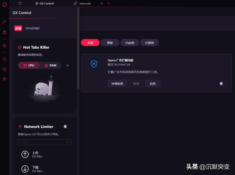 Opera GX的主要功能之一是CPU,RAM,网络限制器,允许用户控制浏览器使用这些资源的数量,甚至允许用户自动关闭占用太多内存和CPU资源的特定标签。这是听起来是一个简单的功能,可以对你的互联网体验进行专门的控制,但是即使在比较好地Google Chrome浏览器和扩展程序中,也很难获得这些功能。