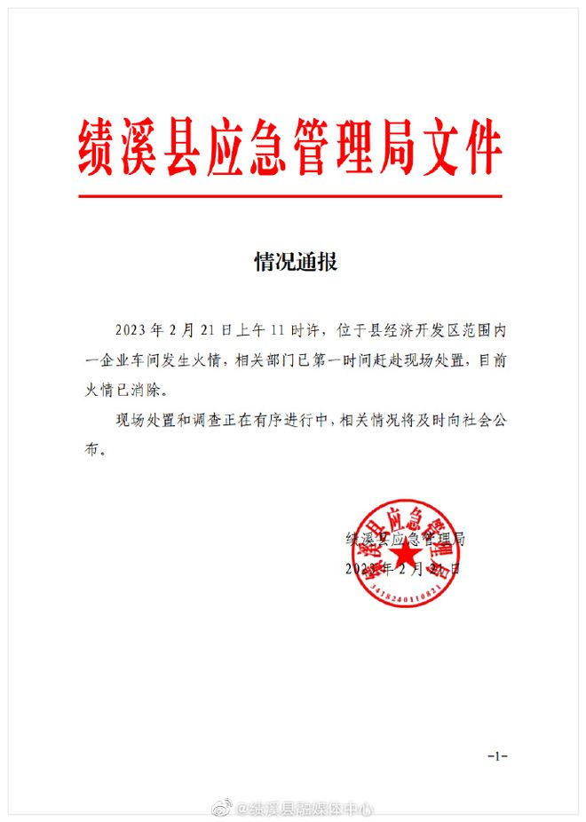 @绩溪县融媒体中心 微博消息,绩溪县应急管理局通报,2月21日上午11时许,位于县经济开发区范围内一企业车间发生火情,相关部门已第一时间赶赴现场处置,目前火情已消除。现场处置和调查正在有序进行中,相关情况将及时向社会公布。另据@百姓关注 微博消息,当地生态环境分局一名工作人员称,起火点系一家杀虫剂生产工厂,主营业务是杀虫剂原药的稀释和罐装。至于网友们所关注的气体是否有毒一事,要等待事故调查结果出后,才能确定。