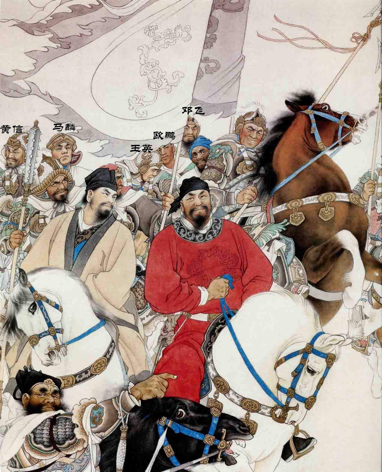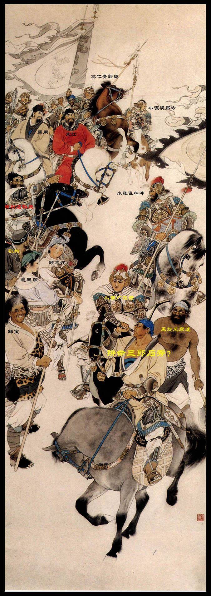 最前面右方4位是攻打祝家庄有大戏份的,最前面吹号的是石秀,因为是他探的庄,引的路。然后花荣射灯、李逵杀了祝龙祝彪、林冲擒了扈三娘。