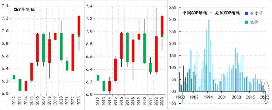 2013年以来中国国际收支已趋于并一直保持着基本平衡,人民币汇率的双向波动也因此顺势形成,2013年以来,CNY的最大波动区间【6.0406,7.3280】,CNH的最大波动区间【6.0162,7.3748】,其中。7.3280的CNY与7.3748的CNH均是去年美元指数高位时出现的;另外,去年GDP不变价增速为3%,仅比美国增速高0.9%,为1990年以来最小幅度(高于美国);GDP现价增速为5.3%,更是大幅低于美国增速3.9%,为1982年以来最大幅度(低于美国)。