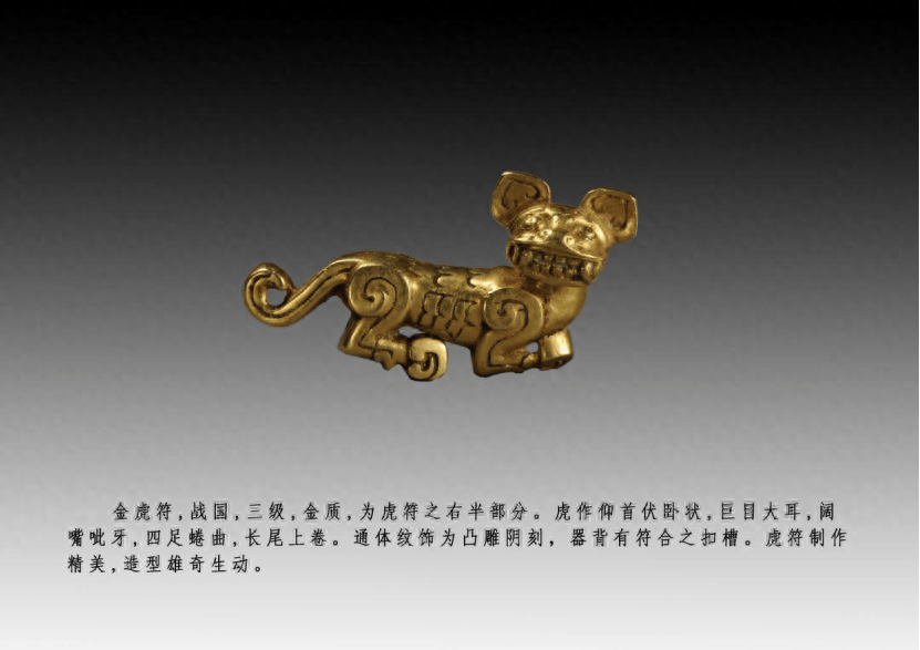 战国金虎符为金质,作卧虎状。巨目大耳,龇牙,四腿曲卧,长尾上卷,通体纹饰为凸雕合阴刻,器背面有扣槽,体形小,但制作精美,雕刻生动,造型雄奇,达到很高的艺术水平,似为仿虎符之作。