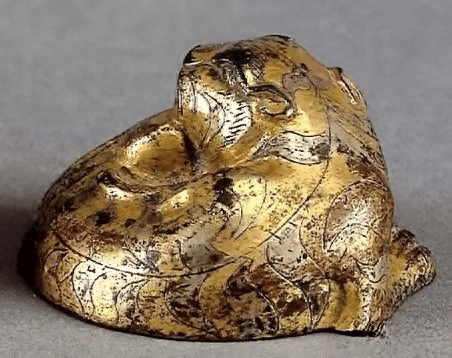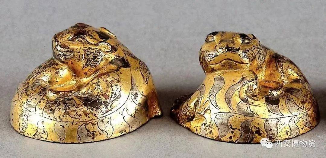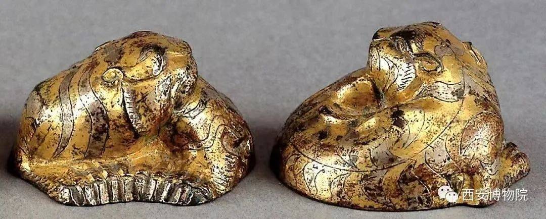 四件虎形镇通体鎏金,其间又有错银。金银两色相间,色彩搭配自然和谐,显得富丽堂皇。底部中心有一圆孔,可由此向内灌铅以增加重量。铜镇铸为猛虎形,有驱魔辟邪之意。