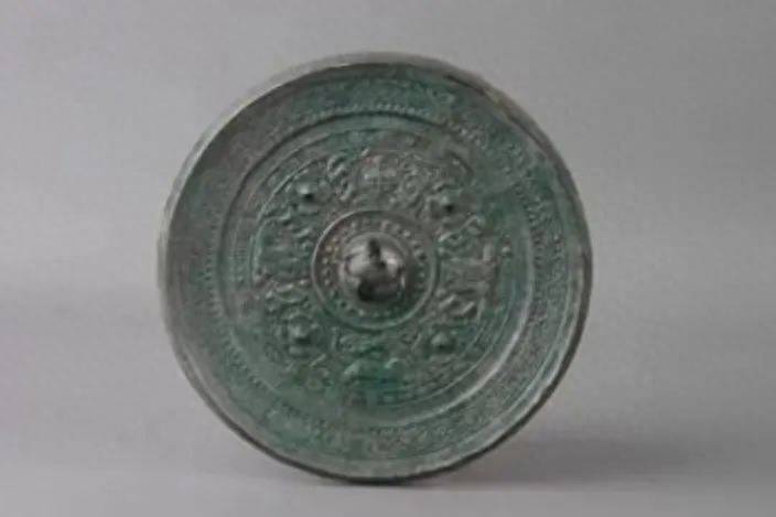 呈圆形,直径18.4厘米,重0.75千克。1966年西安市莲湖区八一铁厂201工地出土。镜背有圆钮,联珠纹钮座,画纹带缘,座外一周立墙式凸棱。