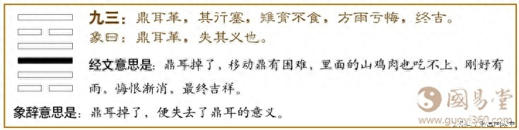 经文意思是:鼎耳掉了,移动鼎有困难,里面的山鸡肉也吃不上,刚好有雨,悔恨渐消,最终吉祥。