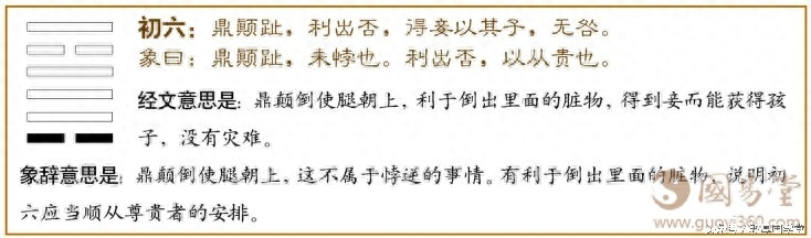 象辞意思是:鼎颜倒使腿朝上,这不属于悖逆的事情。有利于倒出里面的脏物,说明初六应当顺从尊贵者的安排。