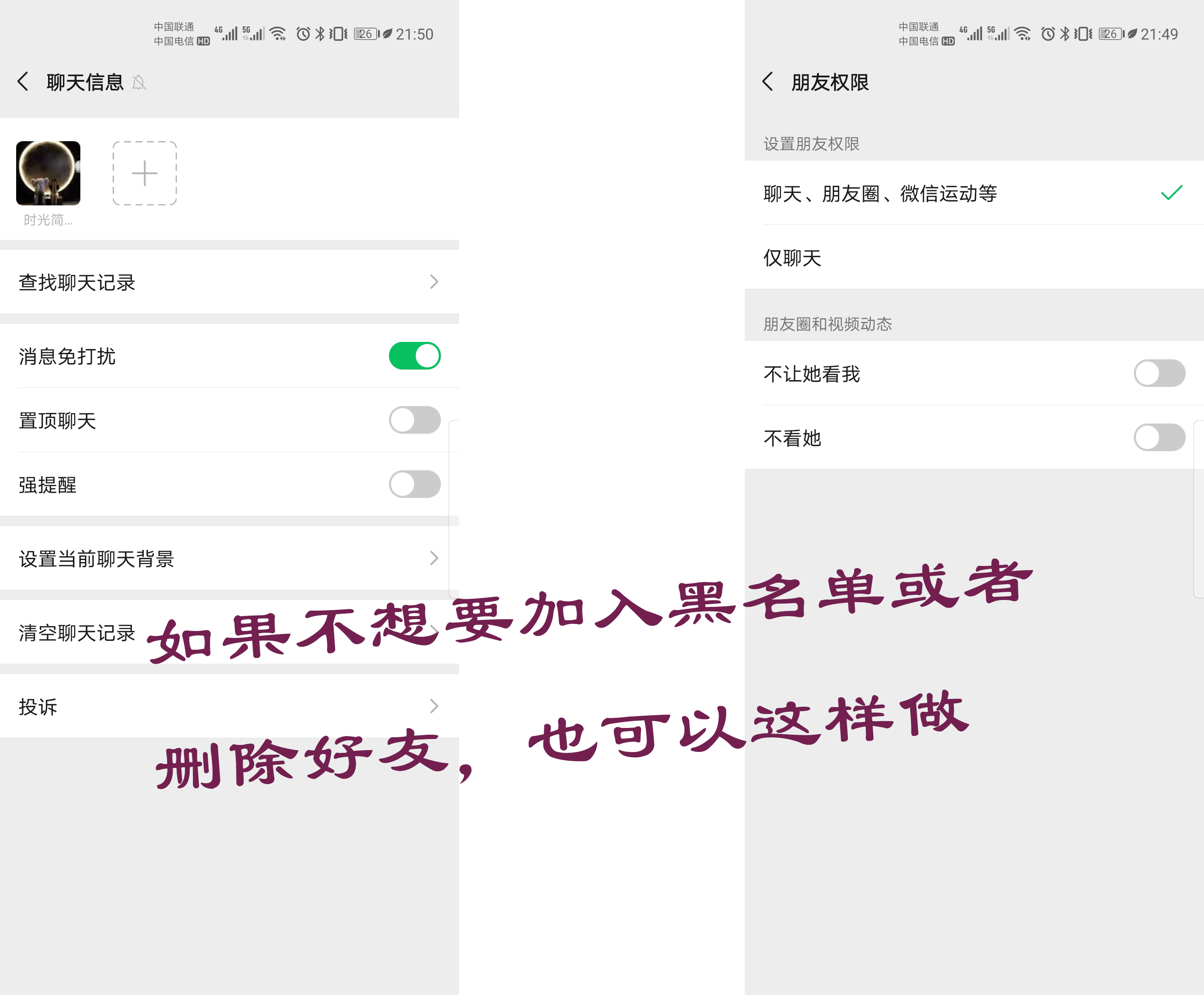 一般将好友拉入黑名单,要么对方做了过分的事情,或者过分的广告骚扰,不想要再次添加好友,还有就是情侣一旦分手了,有些情侣也会选择这样的方式完全断绝关系,从而……相互之间不再联系!而删除好友并没有那么的过分,就是觉得你在他心中不那么重要,或者可有可无。觉得删除了就好!删除好友并没有那么过分的瓜葛,只是觉得不必要,不重要了,就删除了就好。而拉入黑名单就表示心里的活动是有情感的不满的表达!