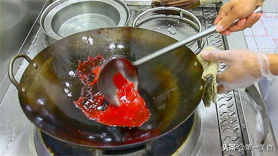 锅内加一勺清水,倒入番茄酱,不停的搅动化开。