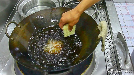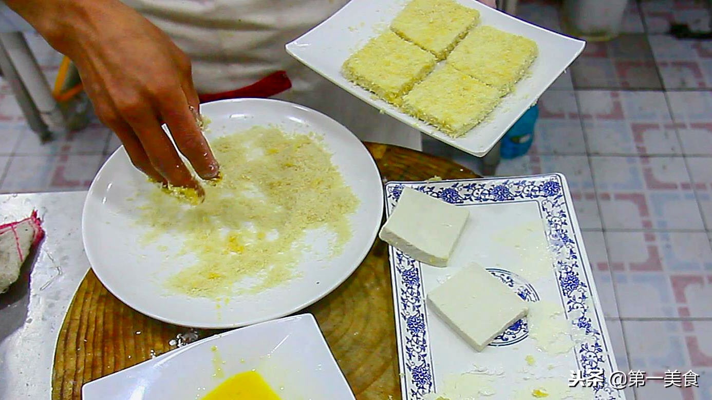 锅内烧油,把油烧至微微冒烟(5成热),将裹好面包糠的豆腐下锅。