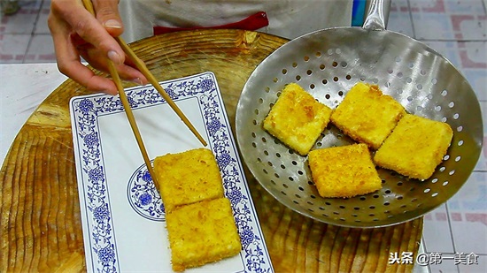 这个过程,要开小火慢慢炸,怕豆腐粘在锅底,可以晃动锅,轻推豆腐,动作不易太大,豆腐炸至金黄,即可捞出控干油摆盘。