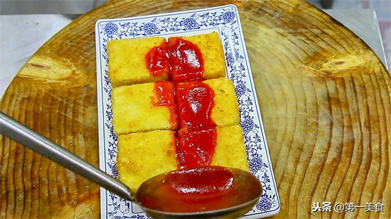 然后加一大勺白糖,一小勺白醋,这个时候要不停的搅动,汤汁变为粘稠起大泡,倒入一小勺热油,搅拌均匀以后,就把糖醋汁浇在炸好的豆腐上。