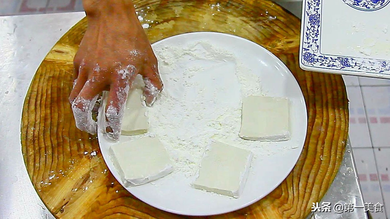 玉米淀粉倒在盘中,把豆腐块上面裹匀淀粉。