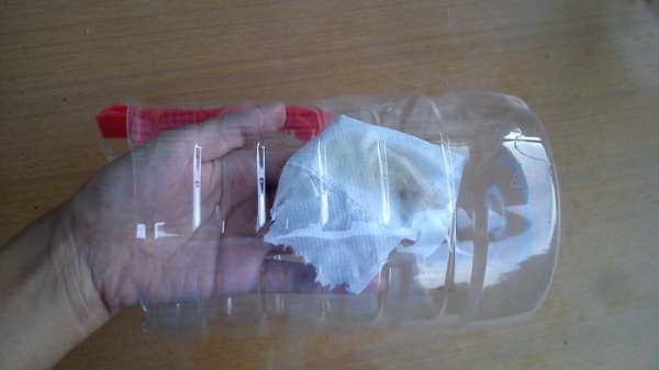 4过后可以用张卫生纸沾上食油涂抹到空油瓶。从瓶子中间开始涂抹到底部。注意 (瓶子一半以上的部分不要涂抹)