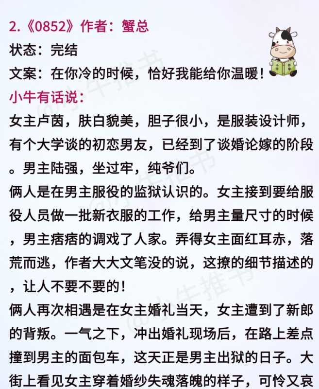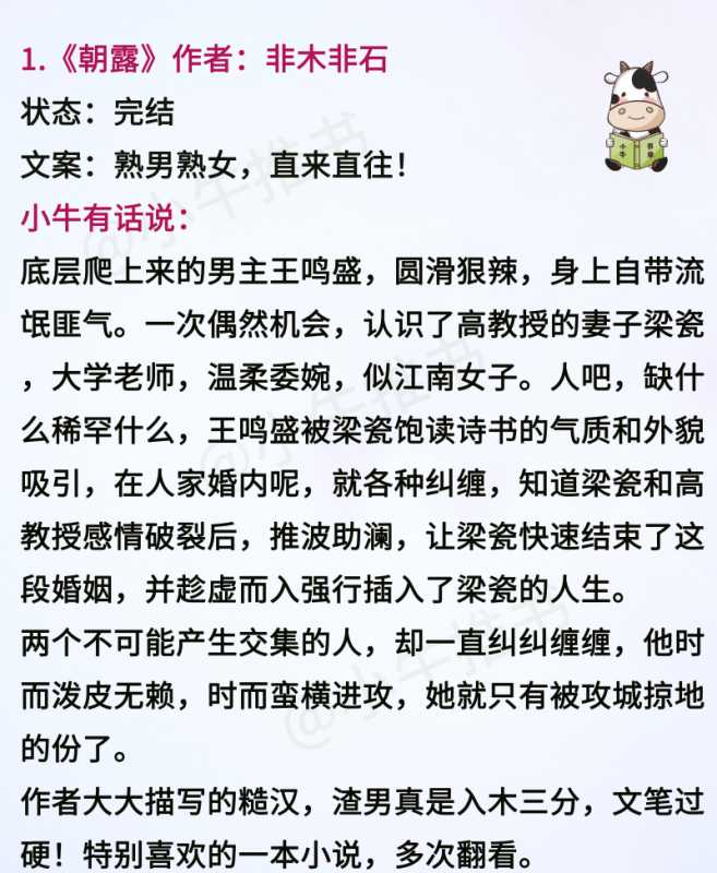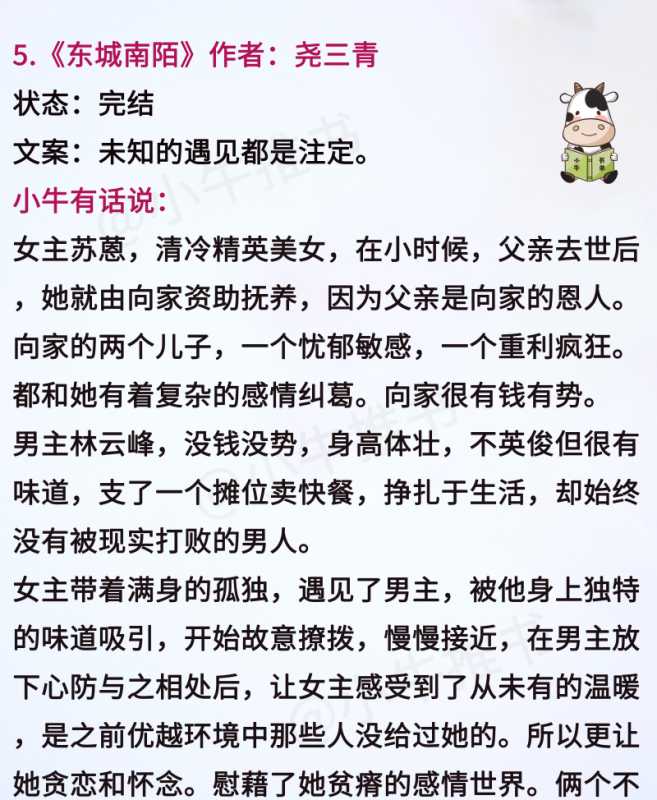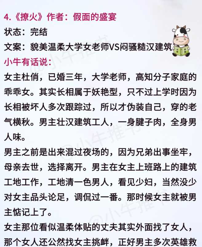 大家好,小牛我又来推书啦,一天不见,甚是想念呀!这两天我看了一部两年前很火的电视剧,叫《都挺好》,大家应该也都已经看过了吧,里面姚晨和杨祐宁饰演的情侣,有没有觉得很带感!让我一下子就想起一类小说,叫糙汉文,熟男熟女,直来直往呀!什么叫糙汉文呀?不太好解释,但看了我的推文内容你肯定就明白啦!给大家安排5本,比较经典的糙汉文,希望你可以喜欢。而且糙汉文好看的太多了,所以下几期我还会接着推荐这一系列,请你持续观看哦!点击上方“