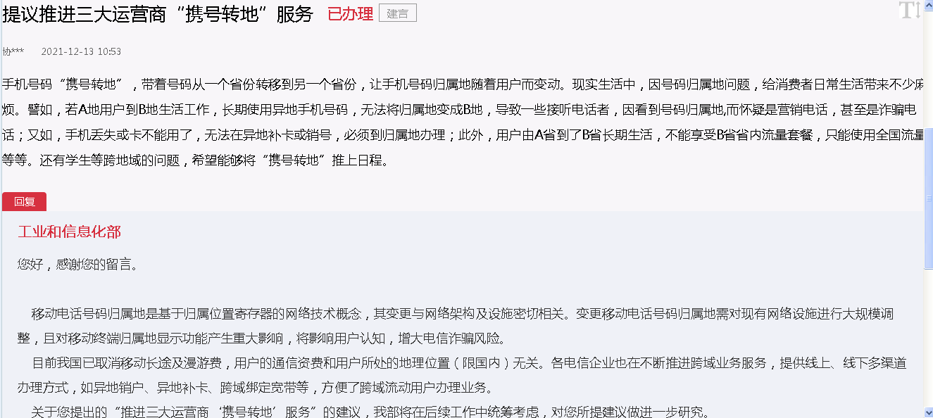 关于网友提出的“推进三大运营商‘携号转地’服务”的建议,工信部将在后续工作中统筹考虑,做进一步研究。