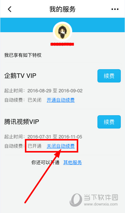 4、在“我的服务”界面,点击“关闭自动续费”;
