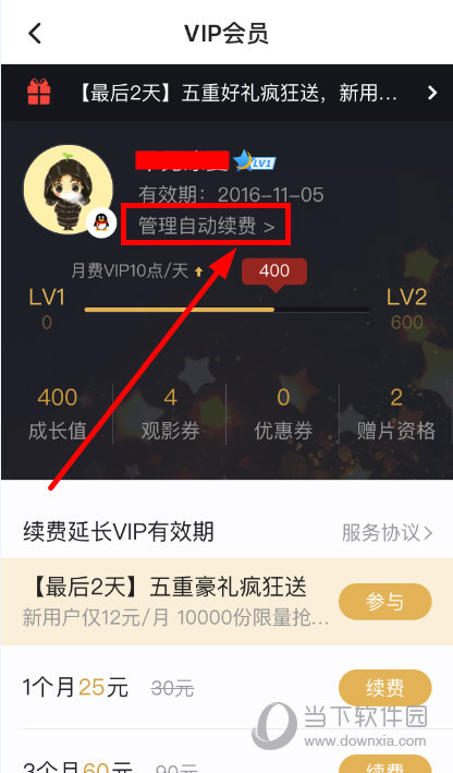 2、在VIP会员界面,点击“管理自动续费”,如图中箭头所示;