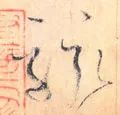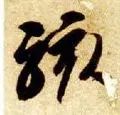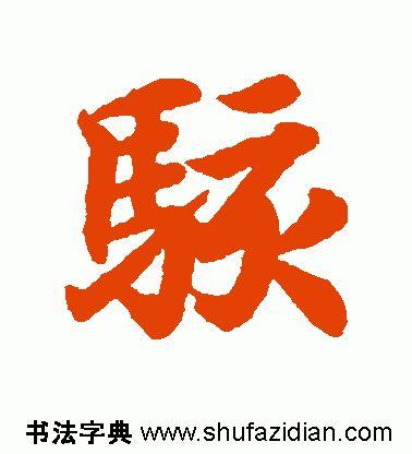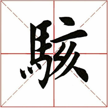 左部“马”字旁斜势抗肩,不要写宽。首笔左竖斜切起笔,竖身稍重,略呈弧形;三个横笔均虚接起笔,大抗肩,勿长,注意变化;中间竖笔实接起笔,略左斜,稍带弧形,与左竖呈相抱之势;横折钩实接起笔,横画与上面横画平行,过中竖即顿笔下行,竖笔左斜,勿重,钩稍大;下面四点可以写成三点,点点呼应,靠上,注意指向。
