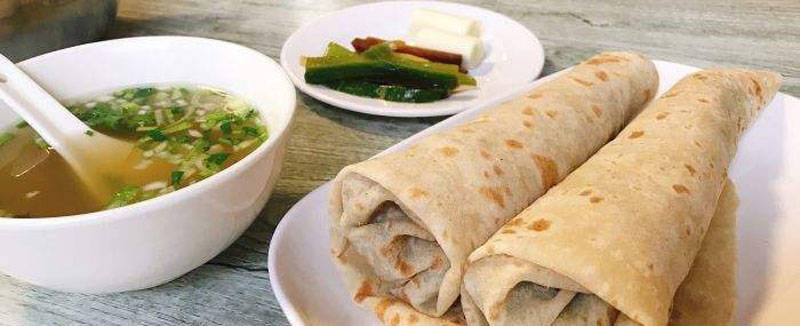 2、碗内放切碎的葱末、香菜末、花椒面、味精,冲入骨头汤。用单饼卷入自己喜欢的食材就可以开吃。
