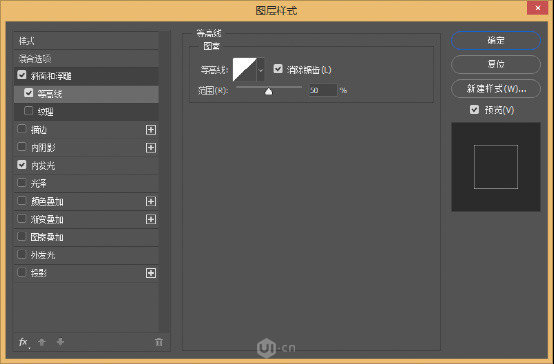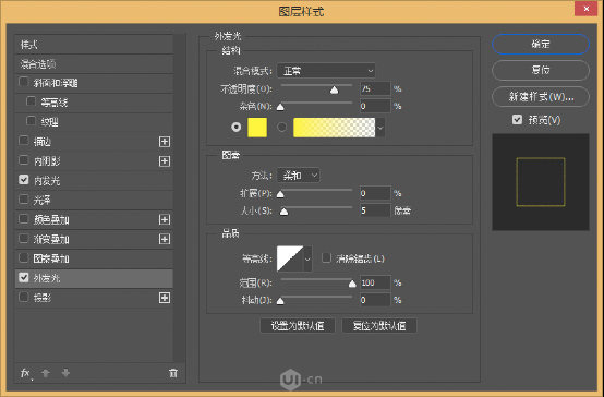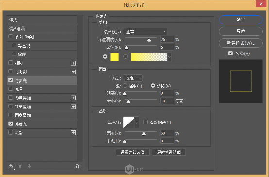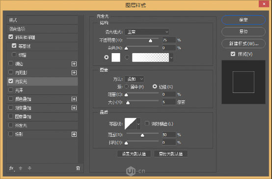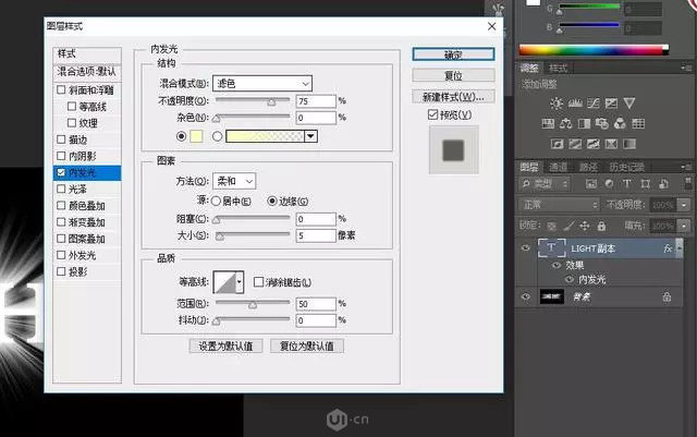 9. 显示文字图层,在菜单中执行“图层/图层样式/内发光”命令,打开“内发光”对话框,其中的参数值设置如图所示。
