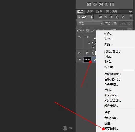 建新的填充与调整图层”按钮,在弹出的菜单中选择“渐变映射”,如图所示。
