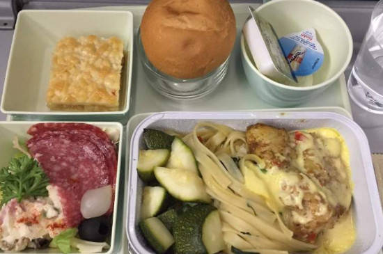 飞机上饮料和食物是免费的,全部由航空公司配定。飞机上有厨房,但餐点由地面的中央厨房制作完成,再急速冷却后,运送至飞机上保存,等到飞机稳定飞行时,就可以将所有餐点简单加热后,组合起来送餐即可。