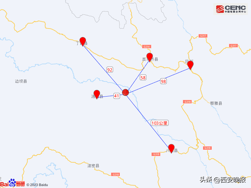 震中距洛隆县41公里、距类乌齐县58公里、距丁青县92公里、距卡若区98公里、距八宿县103公里,距昌都市97公里,距拉萨市510公里。