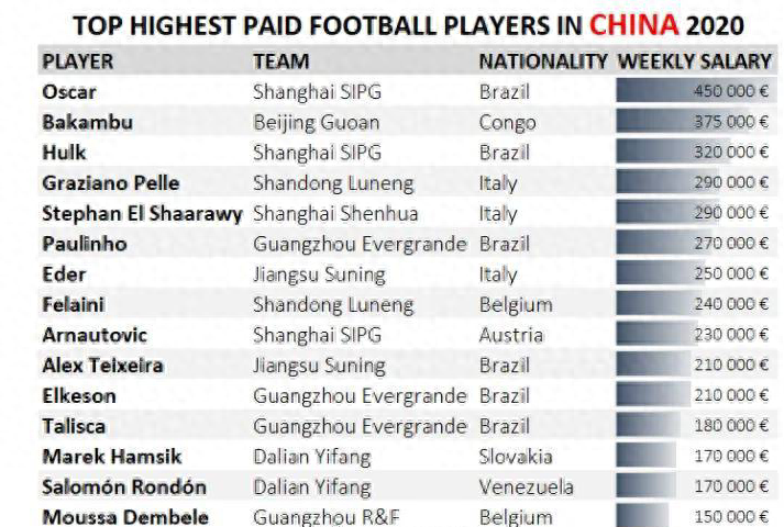 中超外援的薪水普遍较高,这是公开的秘密,这也是中超吸引外援的最大砝码。中超外援的薪水到底高到怎样的程度?5月6日,数据网站Financefootballl发布了2020中超工资TOP15榜单(周薪)。在这份榜单中,上港三大外援奥斯卡、胡尔克、阿瑙托维奇都进入了中超前十。在外援的薪水层面,上港无疑是中超第一。